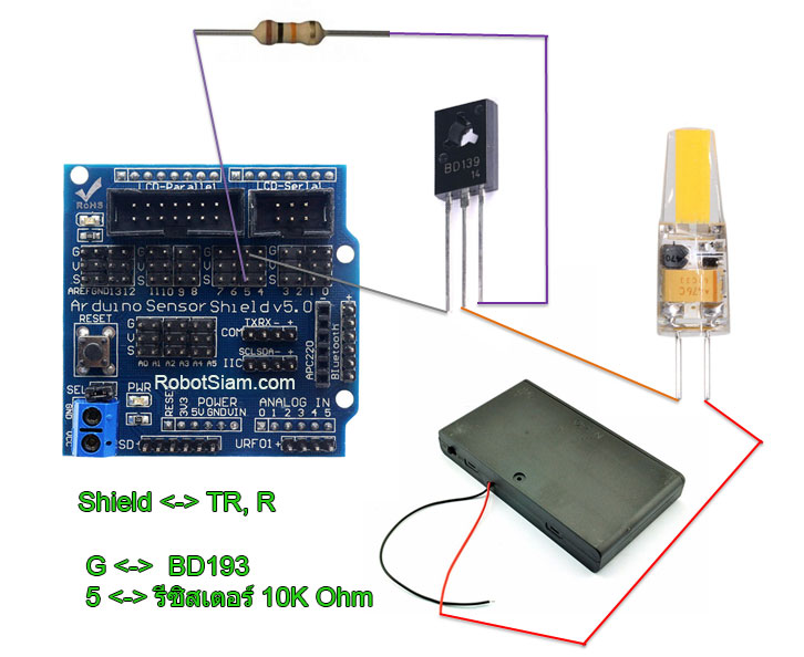 โดยเมื่อได้ค่า PWM มาแล้ว Arduino จะไปสั่งงาน (output) คือ ให้ Pin 5 ส่งค่า PWM ออกไปที่ ทรานซิสเตอร์ BD139 เพื่อให้ทรานซิสเตอร์ควบคุมการจ่ายไฟ จากรางถ่าน 12V ไปยัง LED 12V ที่มีคุณสมบัติหรี่ไฟได้ โดย LED จะสว่างตามค่า PWM ที่รับเข้ามา โดย PWM 255 จะสว่างที่สุด และ PWM 0 ก็จะสว่างน้อยที่สุด